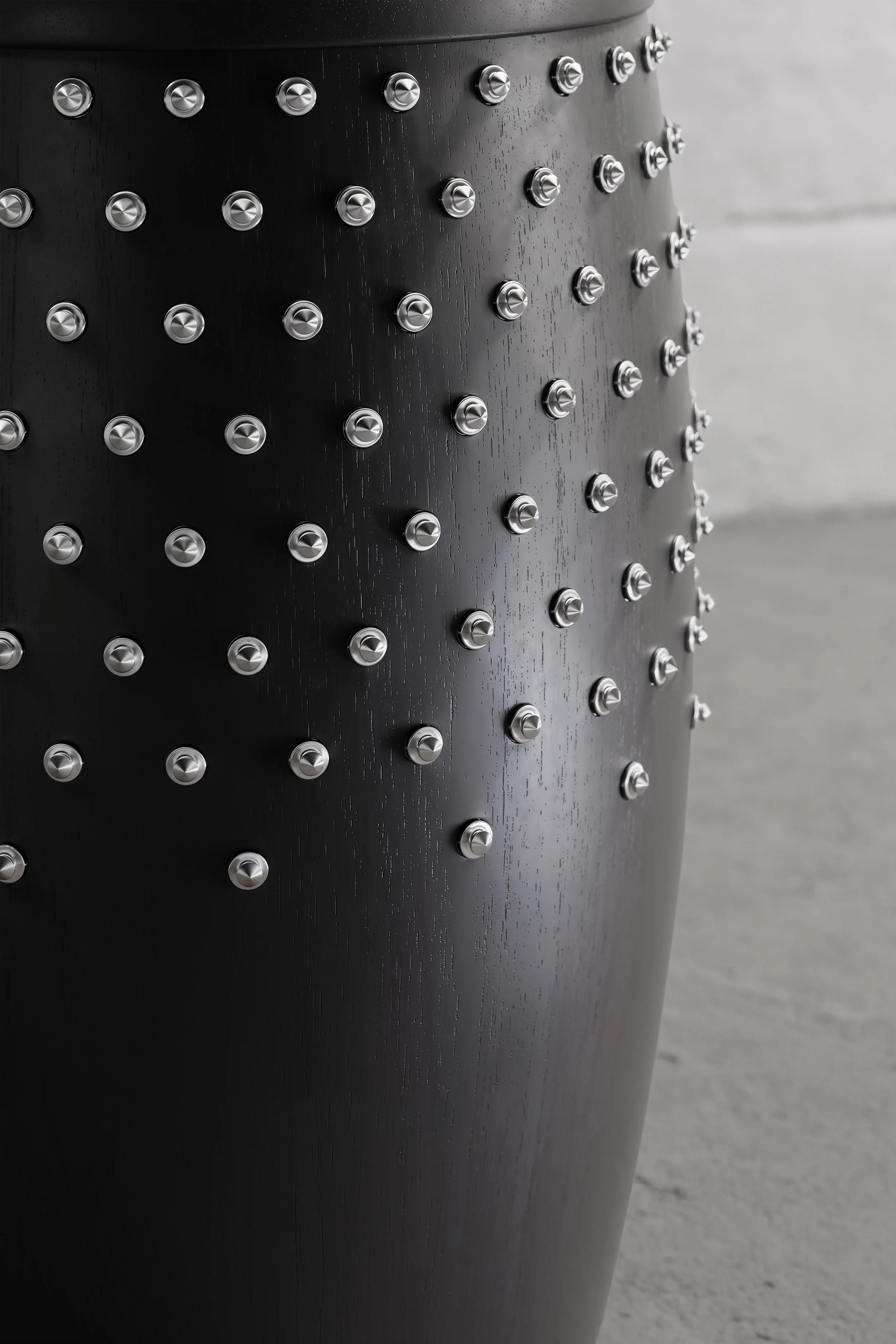 Stool crafted from solid Seike wood with Ébano finish, featuring aged bronze or stainless steel CNC-lathed hardware.